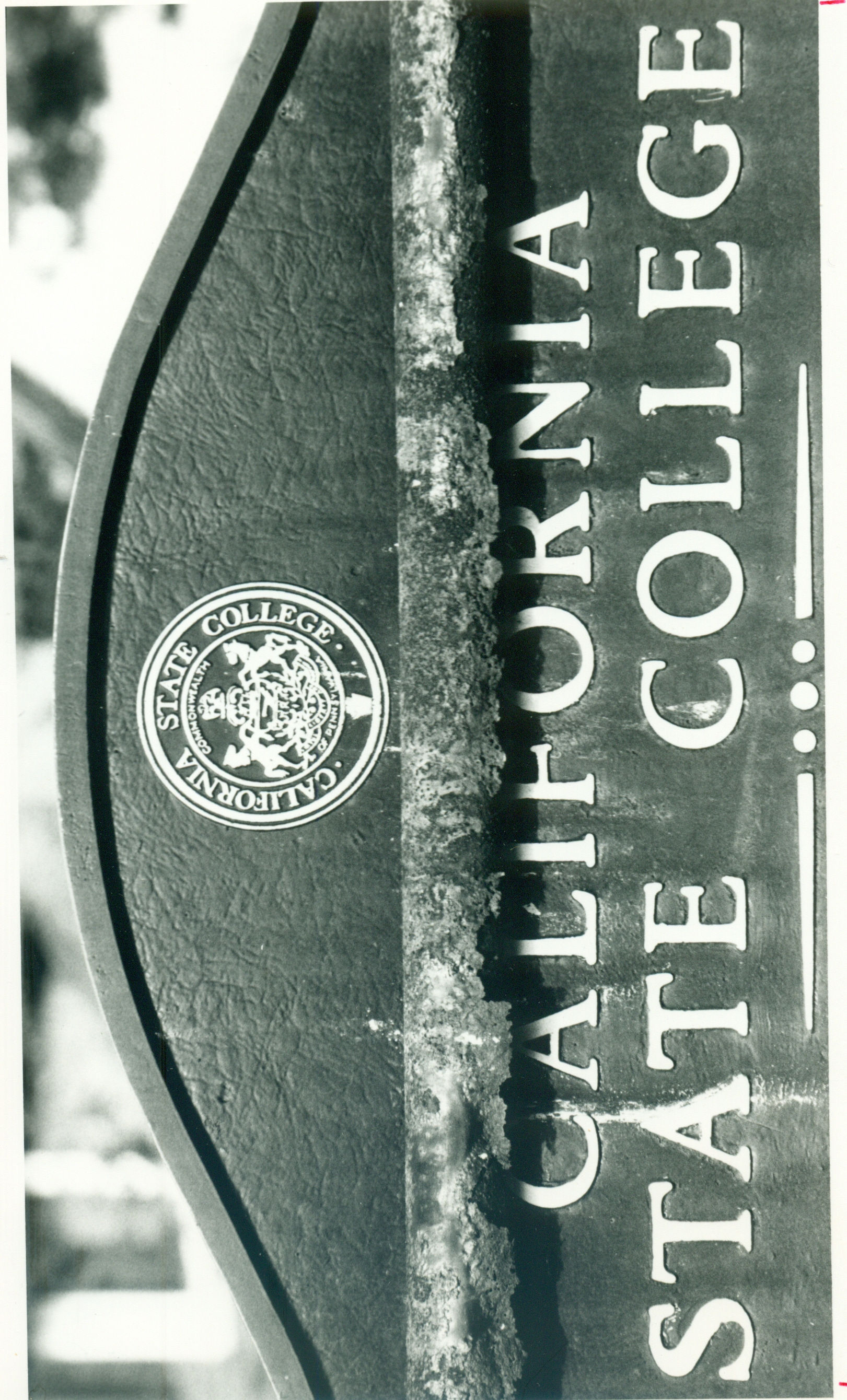 Close up of metal California State College sign
