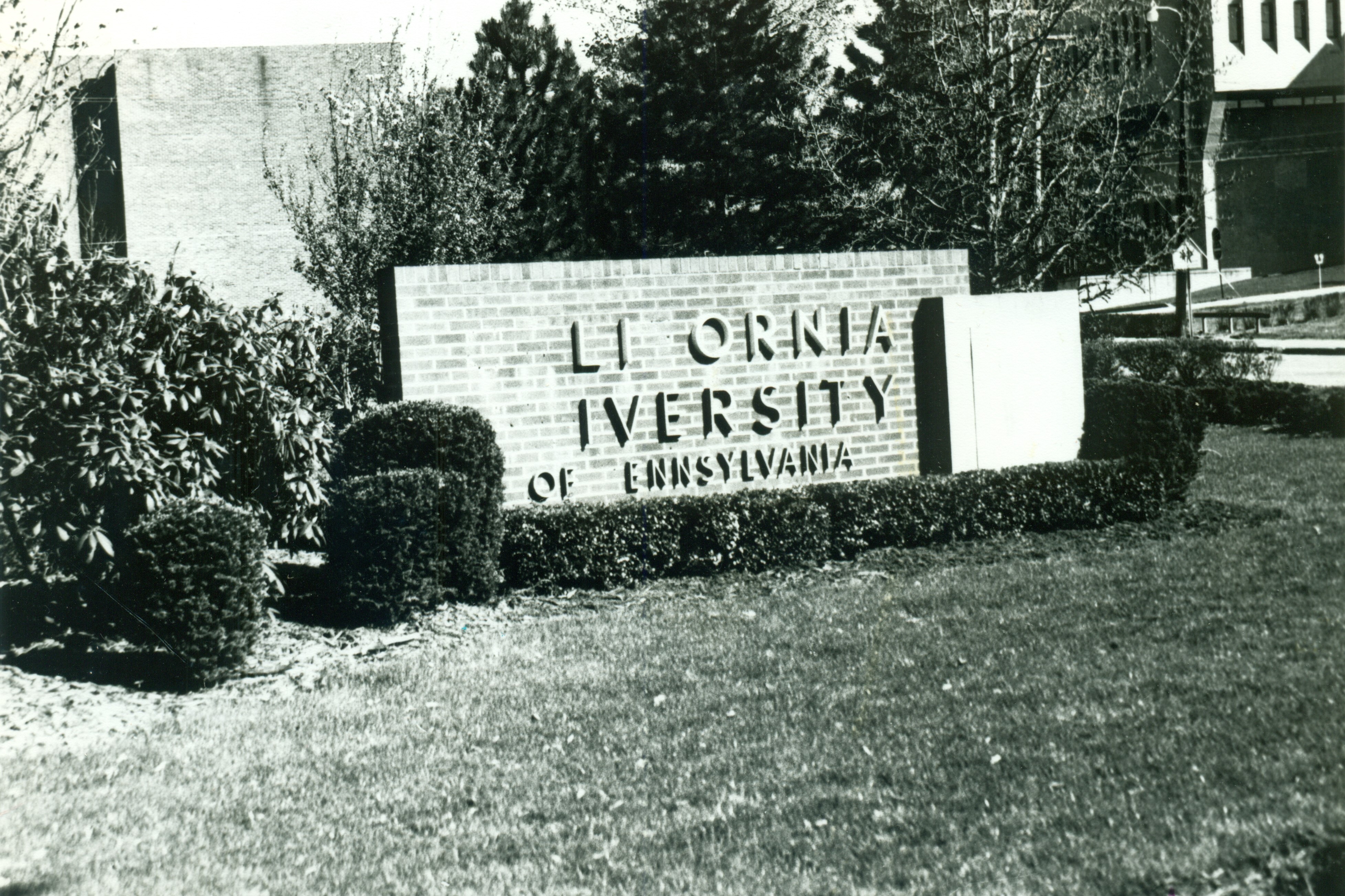 Damaged California University campus sign
