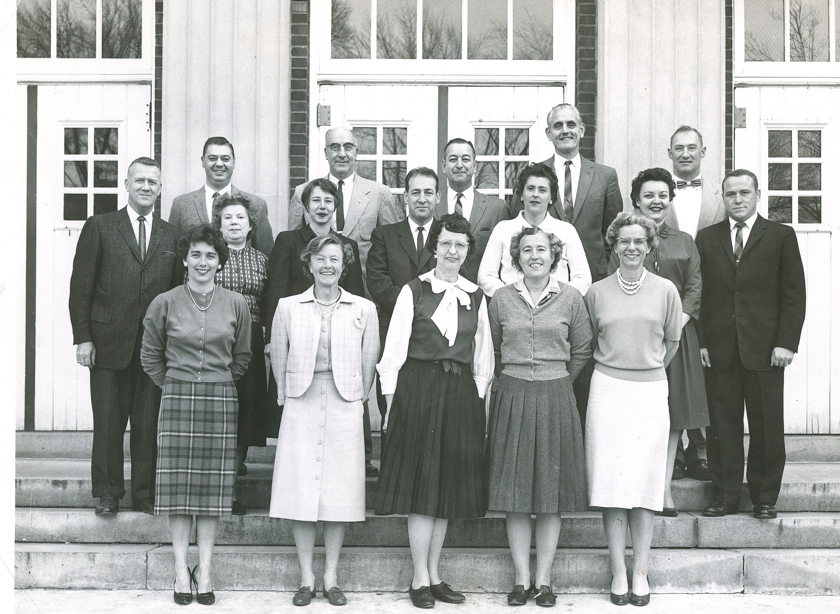 Prominent physical education faculty included in this photograph are Howard DeNike, John Eiler, Frank Sills, and Genevieve Zimbar.