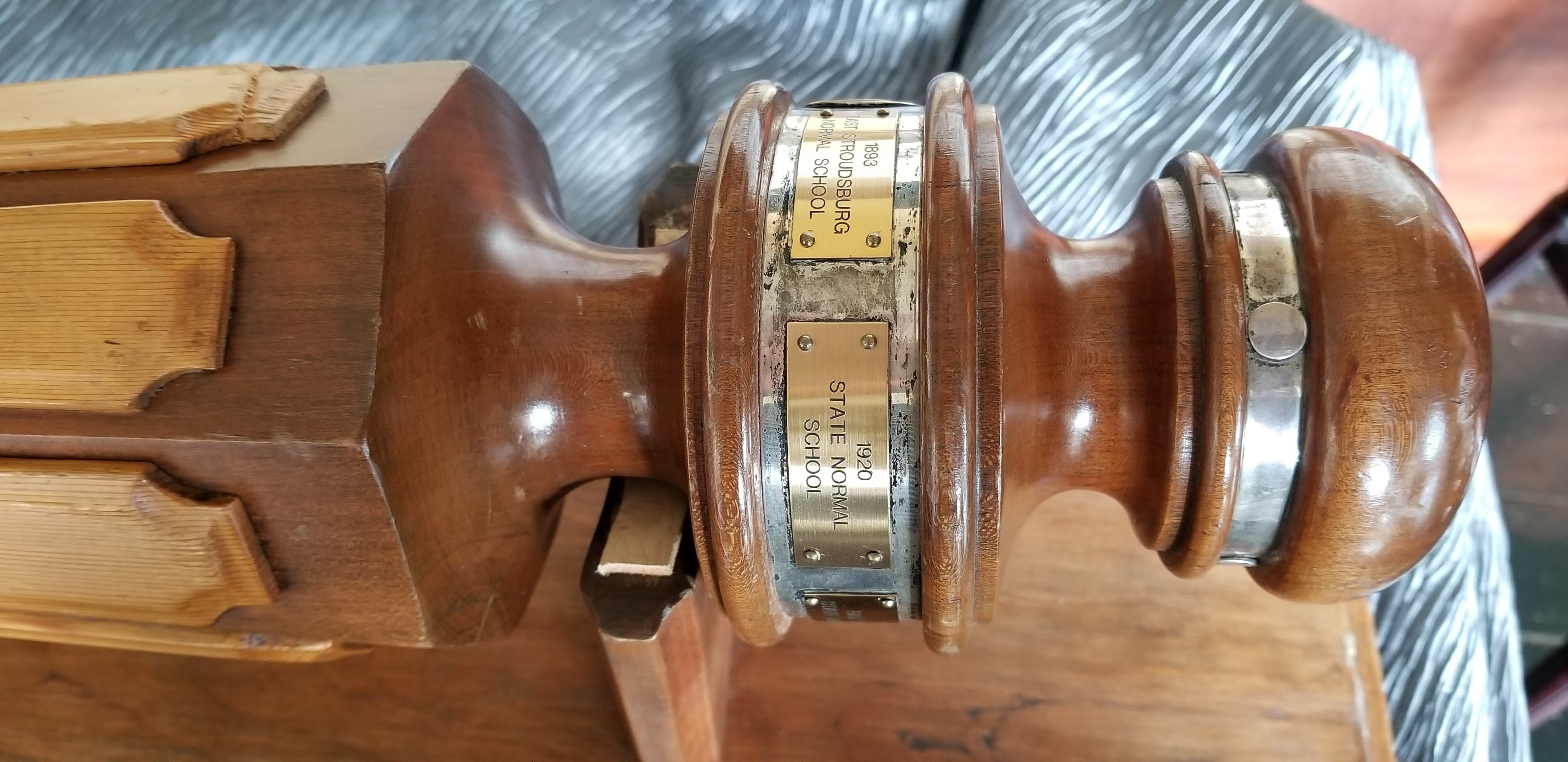 The original East Stroudsburg University mace was commissioned by the ESU Alumni Association in 1969 for the inauguration of 4th President Frank D. Sills. Designed by local Pocono artist Richard E. Phillips, the mace is borrowed from royalty and symbolizes power and authority of the institution to award degrees. This redesigned version from 1987 by the same artist, is currently made of cherry wood and measures 38 inches long. It has overlays of hemlock dating from 1893 which was taken from the original Stroud Hall. The mace is used at all official university functions dealing with academics.