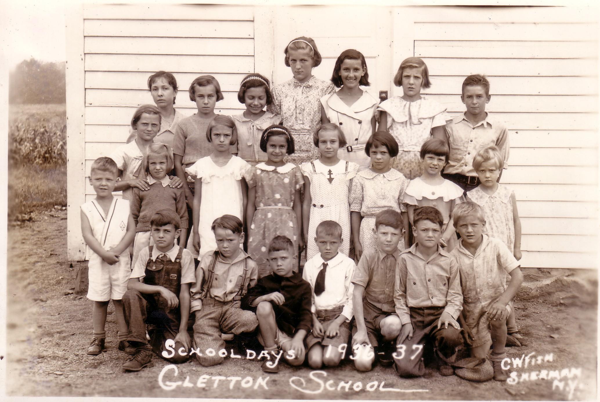 Two identical prints of the 1936-1937 class at Gletton School taken by C. W. Fish, School Photographer from Sherman New York. The photos each measure 12 x 17.6 cm. The photo contains children that Carrie Goodell taught in 1936-1937. Carrie is pictured in the left upper row.