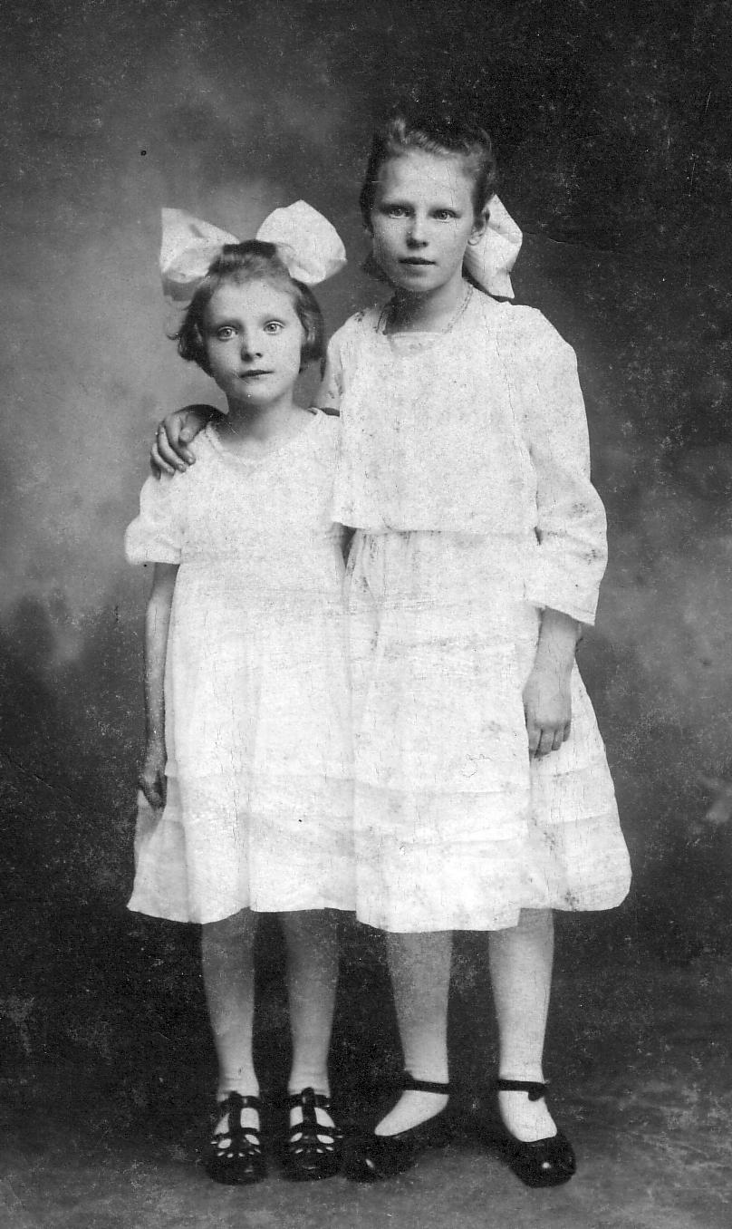 8 X 14 cm black and white full body portrait of two girls in a post card format. Written on the back is "Faye & Isabell Perry."
