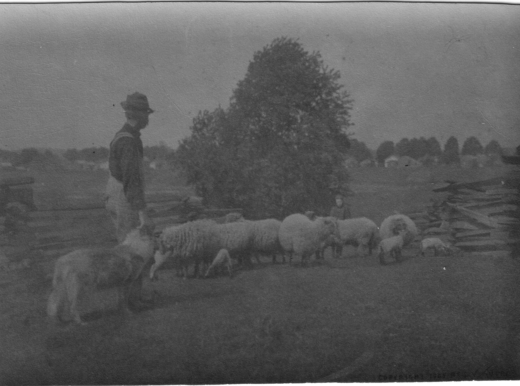 4" X 6" black and white photograph of George Goodell tending sheep on the Goodell Farm. Stamped in small lettering on the front is "Copyright 1909 Kupper."