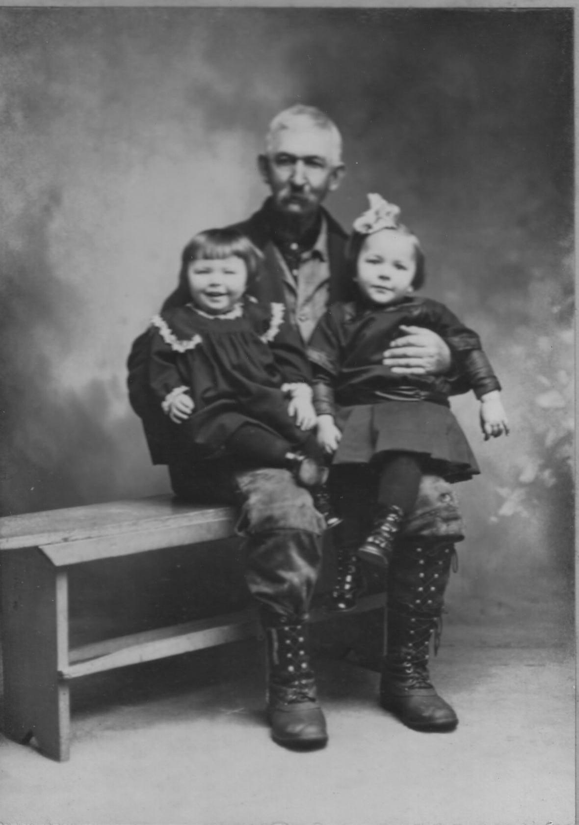 4" X 5.5" black and white portrait photograph of George Goodell holding Margaret and Carrie. There is a Kupper Studio stamp on the cardstock frame.