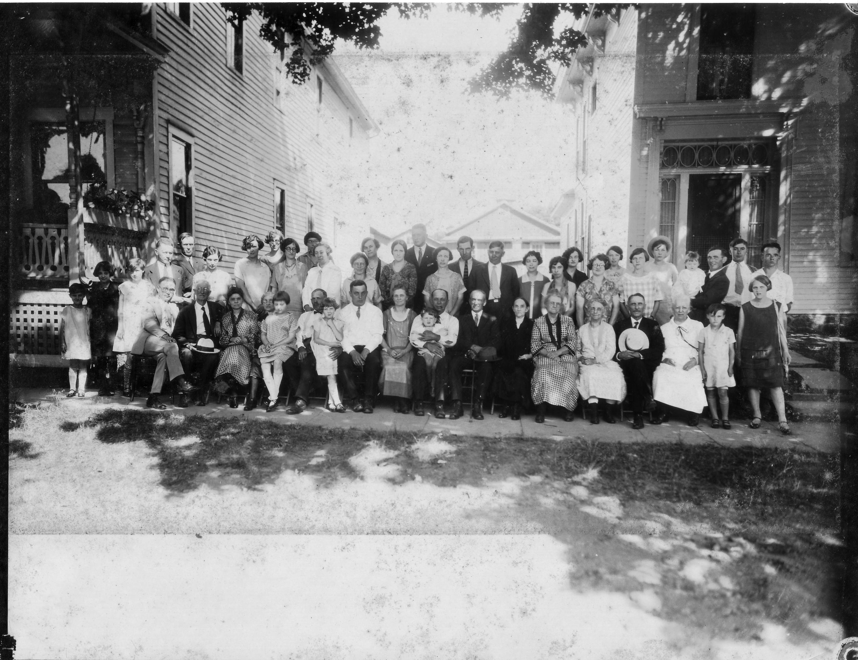 6" X 10" black and white group picture of Gleeten extended family. Written on back "Taken by Baker July 23, 1926. Gleeten Reunion held at Launt Austins.