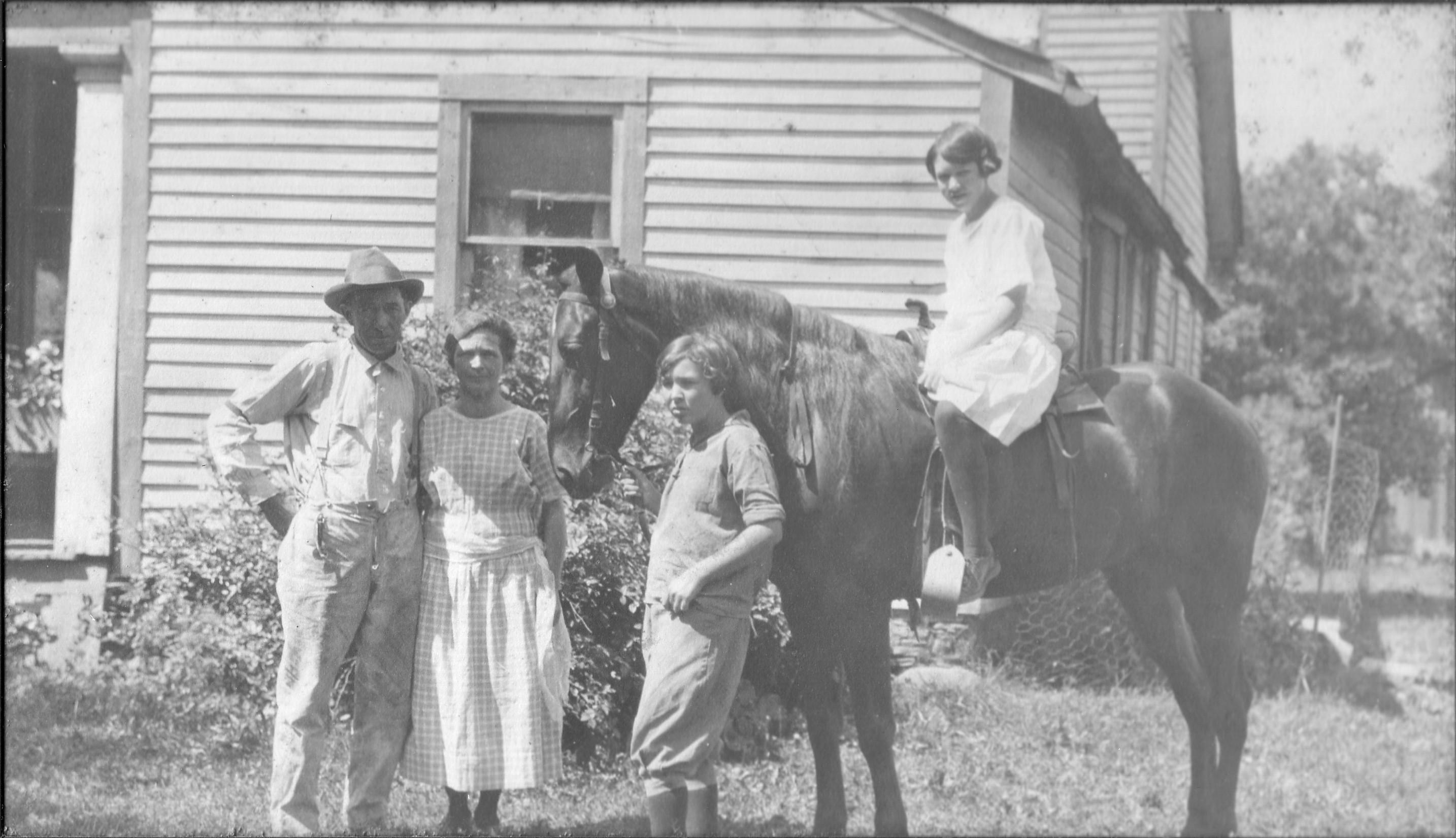 6" X 10" black and white photograph of Todd, Ella, Carrie and Margaret. Margaret is sitting on a horse and Carrie is holding the horse. They are standing in front of the main house.
