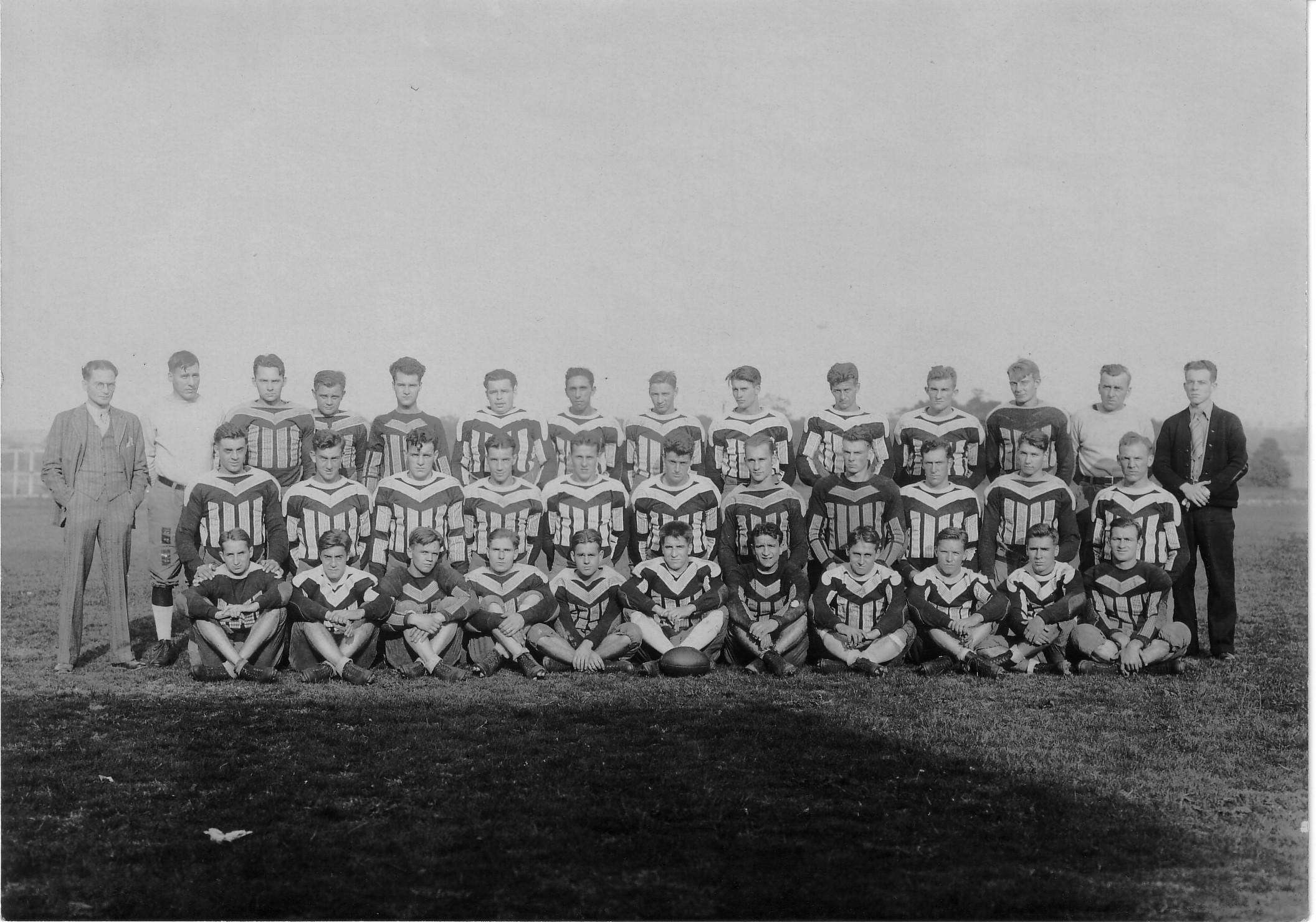 5" X 7" black and white photograph of the Edinboro State Teacher's College football team. The photograph was found in a 1931 yearbook. Everyone in the photograph is identified, row by row, on the back. Also written on back is "Football 1930."