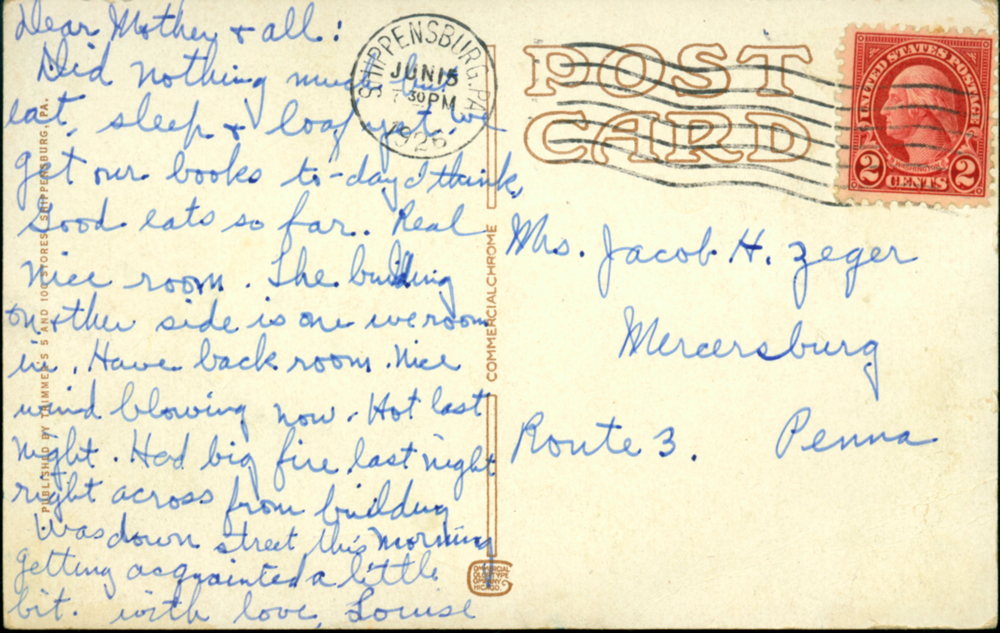 Dear Mother + all: Did nothing much but eat, sleep + loaf yet. get our books to-day I think, Good eats so far. Real nice room. The building on other side is one we room in. Have back room. Nice wind blowing now. Hot last night. Had big fire last night across from building Was down street this morning getting acquainted a little bit. with love, Louise Mrs. Jacob H. Zeger Mercersburg Route 3. Penna