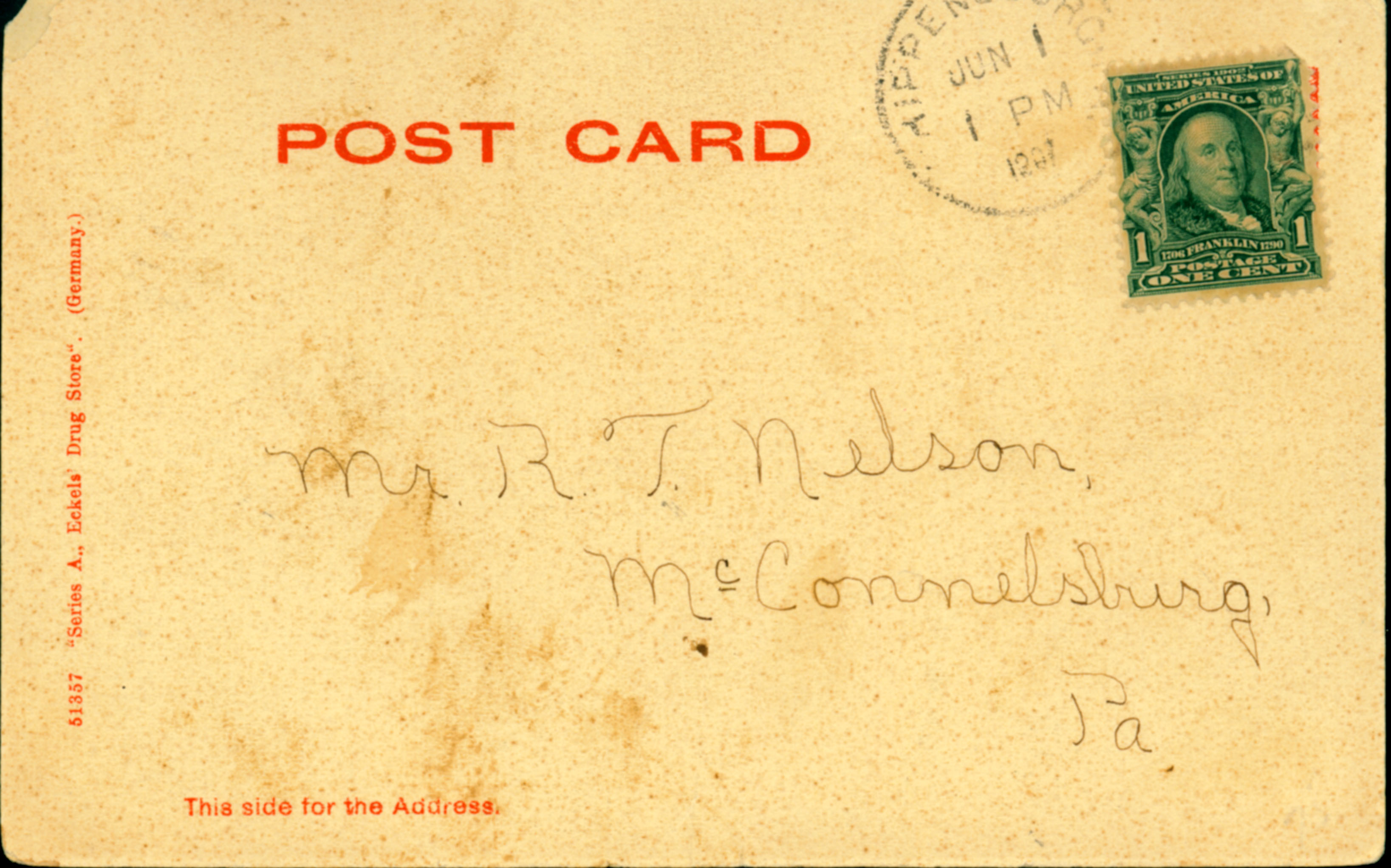 Postcard verso addressed to Mr. R. T. Nelson, McConnelsburg, Pa.