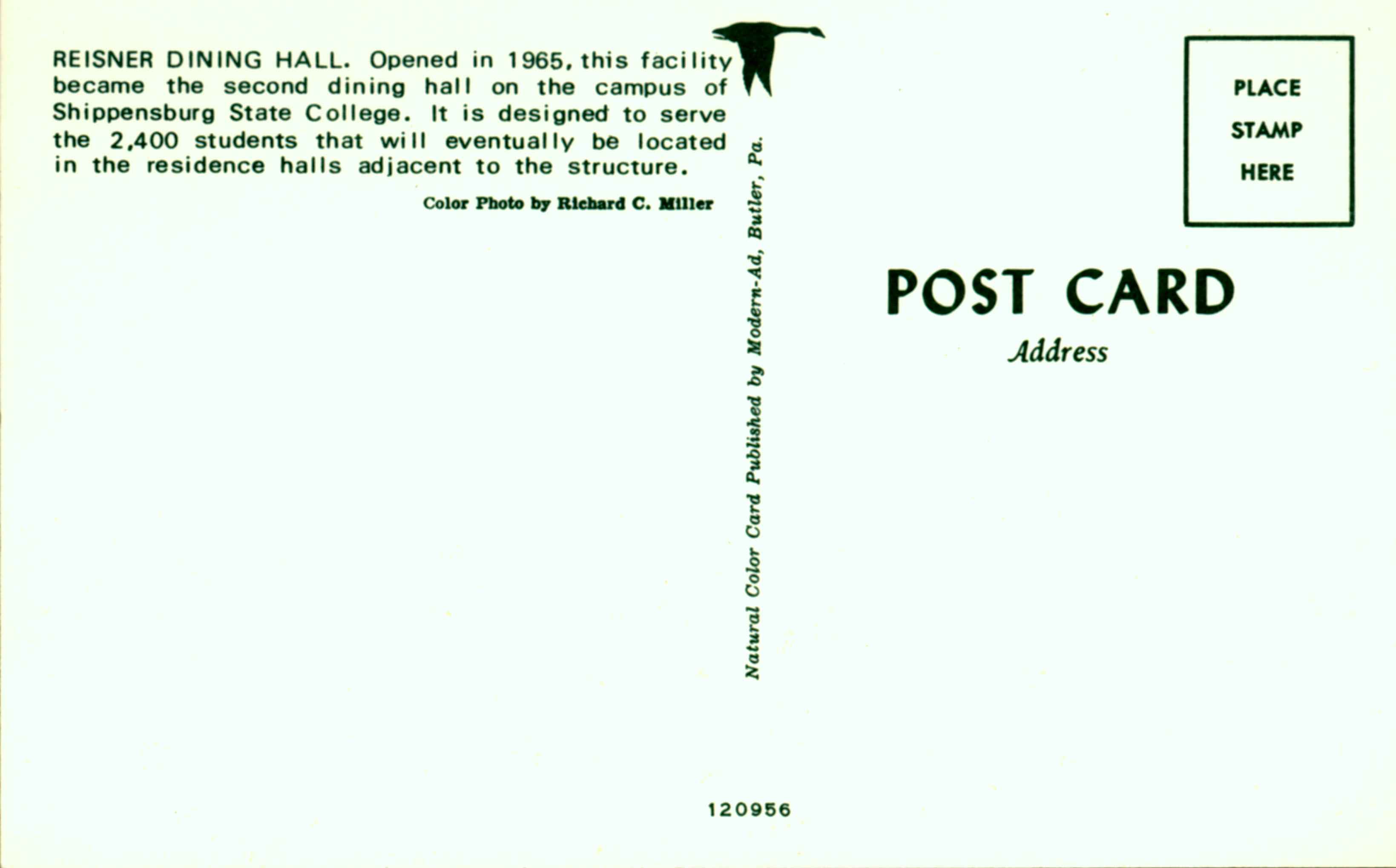 Reisner Dining Hall. Opened in 1965, this facility became the second dining hall on the campus of Shippensburg State College. It is designed to serve the 2,400 students that will eventually be located in the residence halls adjacent to the structure.