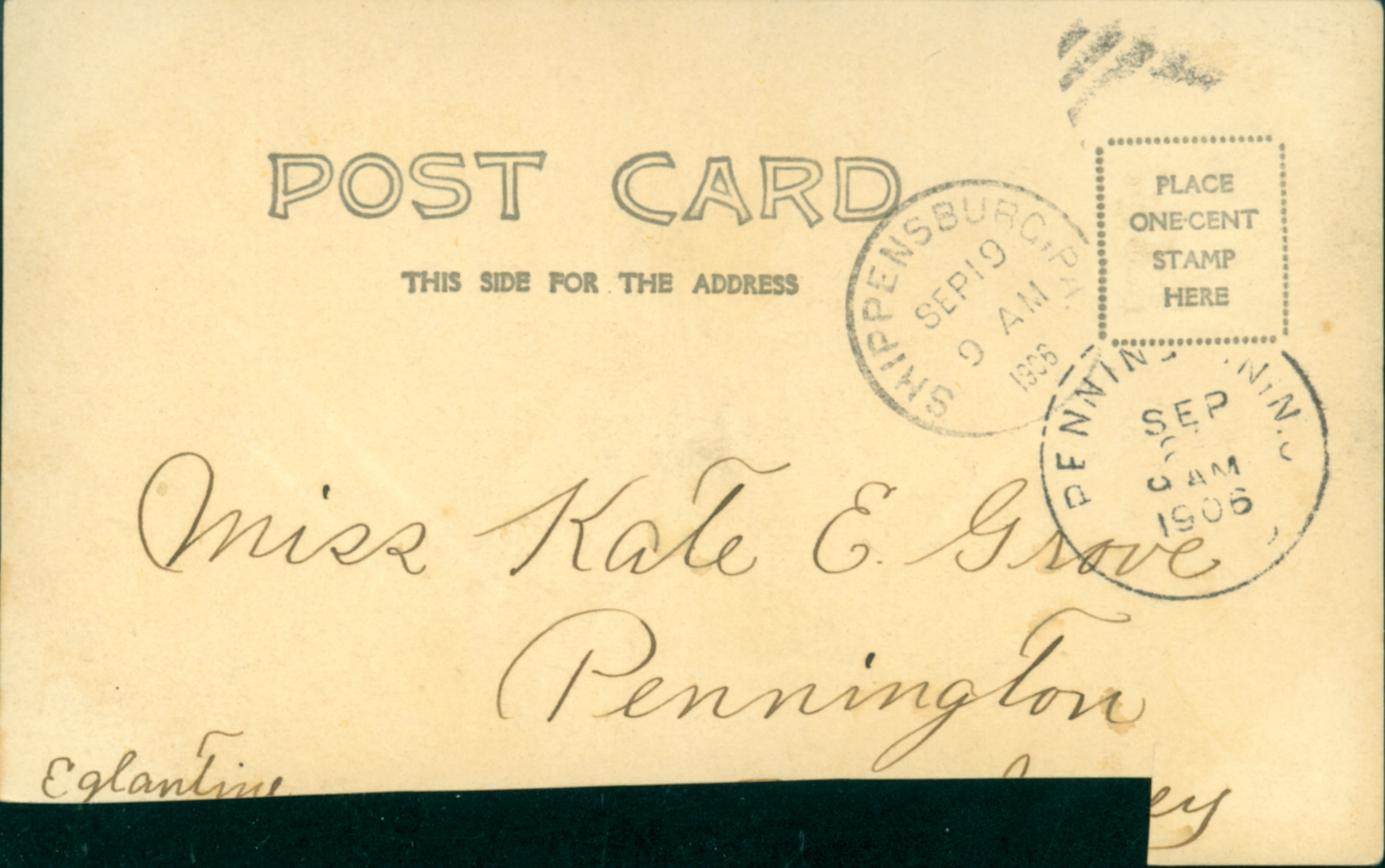 Two post office stamps on verso. Both on right. Appears sent from "SHIPPENSBURG, PA SEP19 9AM 1906" and received "PENNINGTON, N.J. SEP 2-- 9AM 1906"