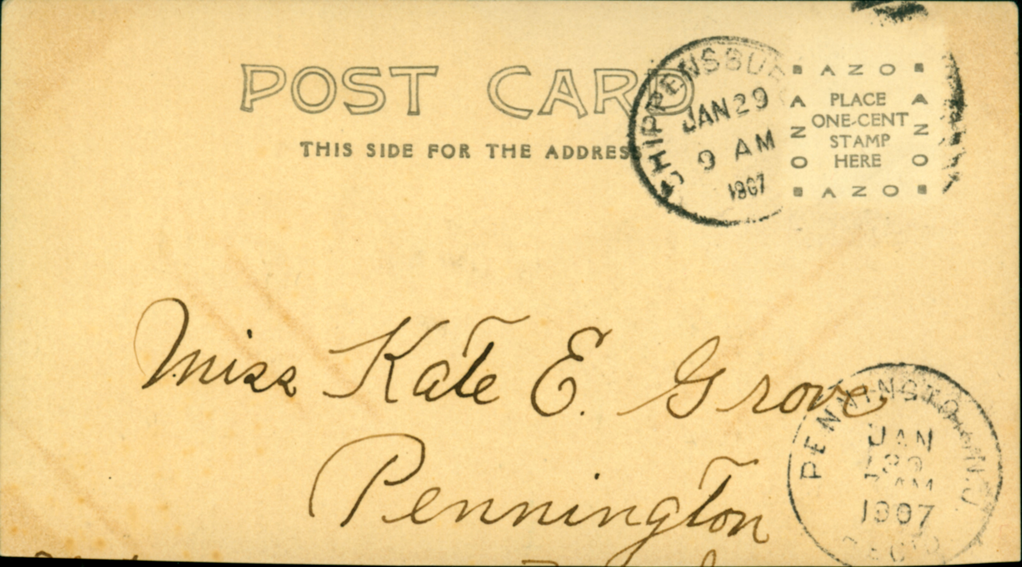 Verso of Reformed Church postcard addressed to: Miss Kate E. Grove Pennington" Possible part of addressee cut off from bottom.