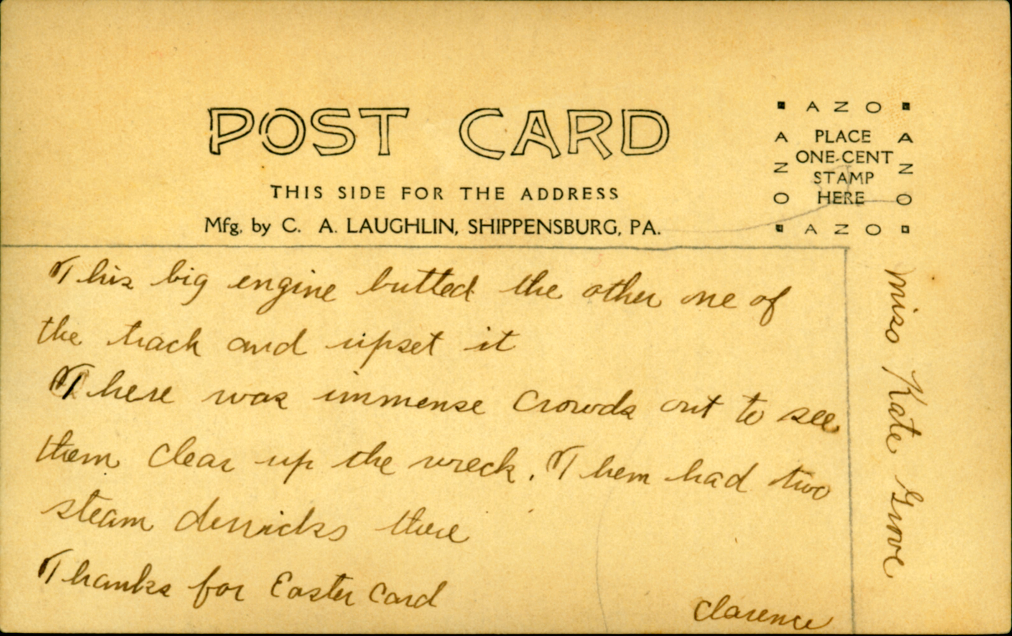 This big engine butted the other one of the track and upset it. There was immense crowds out to see them clear up the wreck. Them had two steam derricks there. Thanks for the Easter card. Clarence