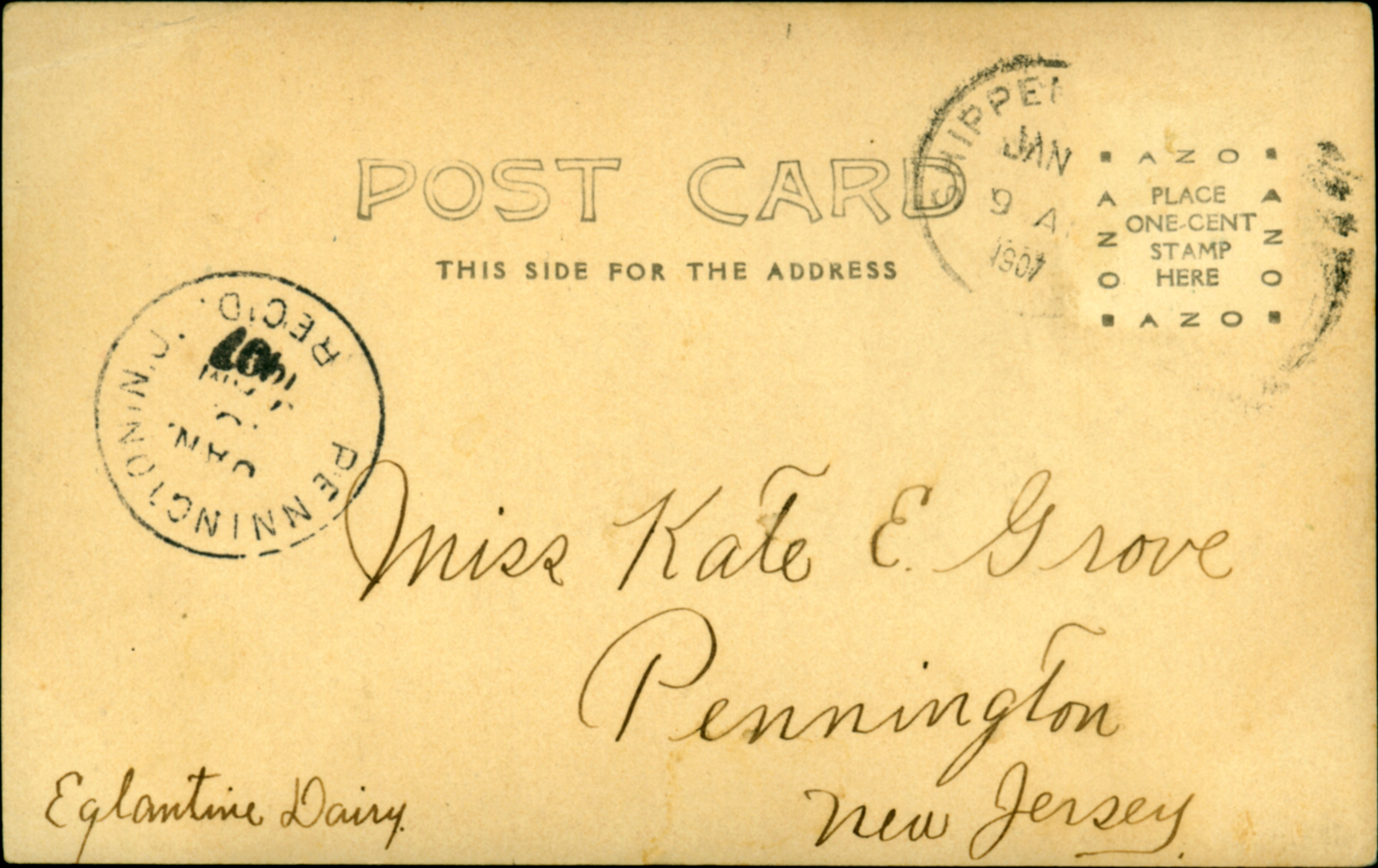 Postcard verso addressed to Miss Kate E. Grove, Pennington, New Jersey