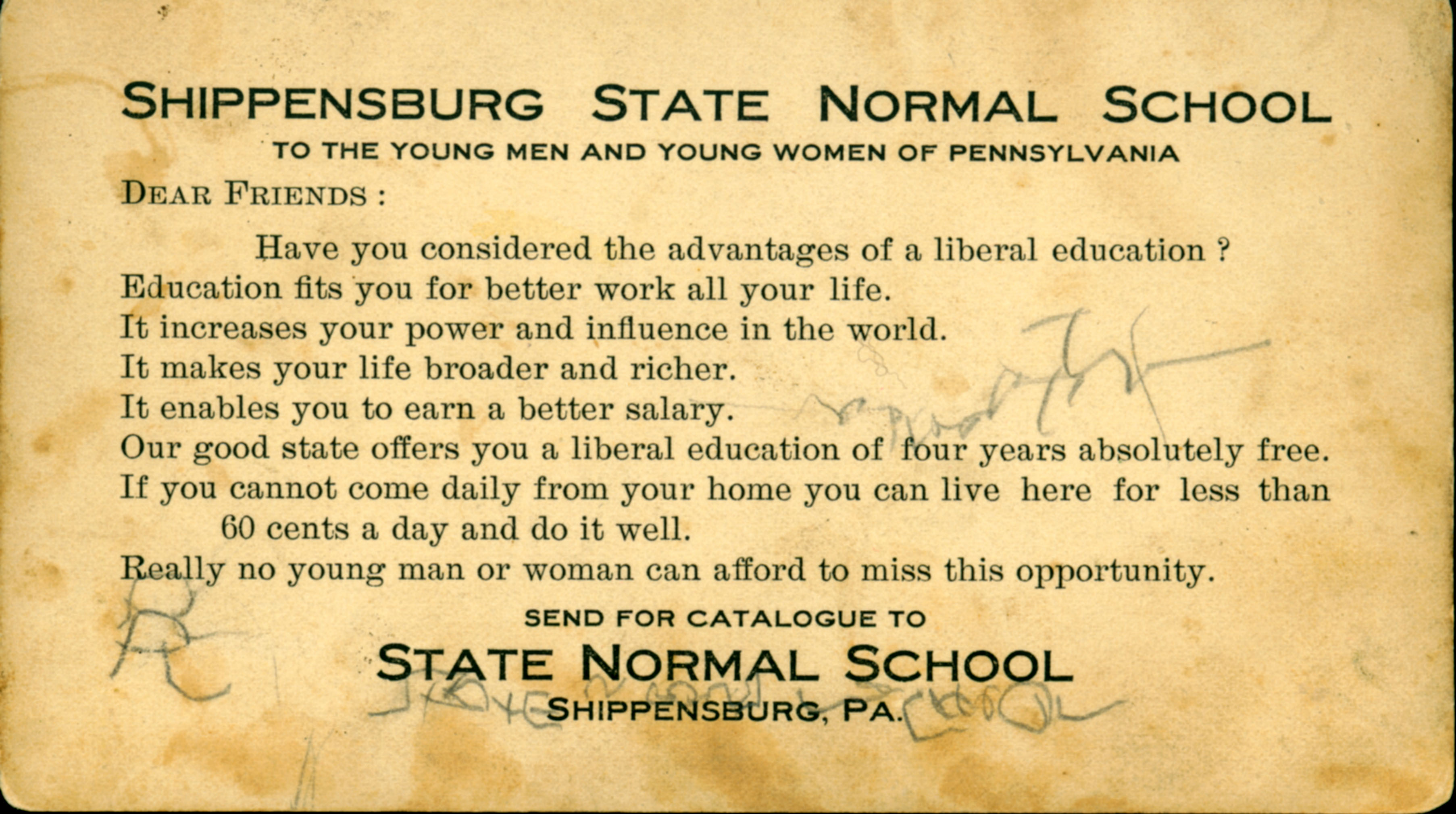 Verso of postcard depicting May Day. Printed on verso :"Shippensburg State Normal School To the young men and women of Pennsylvania Dear Friends: Have you considered the advantages of a liberal education? Education fits you for better work all your life. It increases your power and influence in the world. It makes your life broader and richer. It enables you to earn a better salary. Our good state offers you a liberal education of four years absolutely free. If you cannot come daily from your home you can live here for less than 60 cents a day and do it well. Really no young man or woman can afford to miss this opportunity. Send for catalogue to State Normal School Shippensburg, PA." In pencil appears to be attempted handwriting, likely a child.