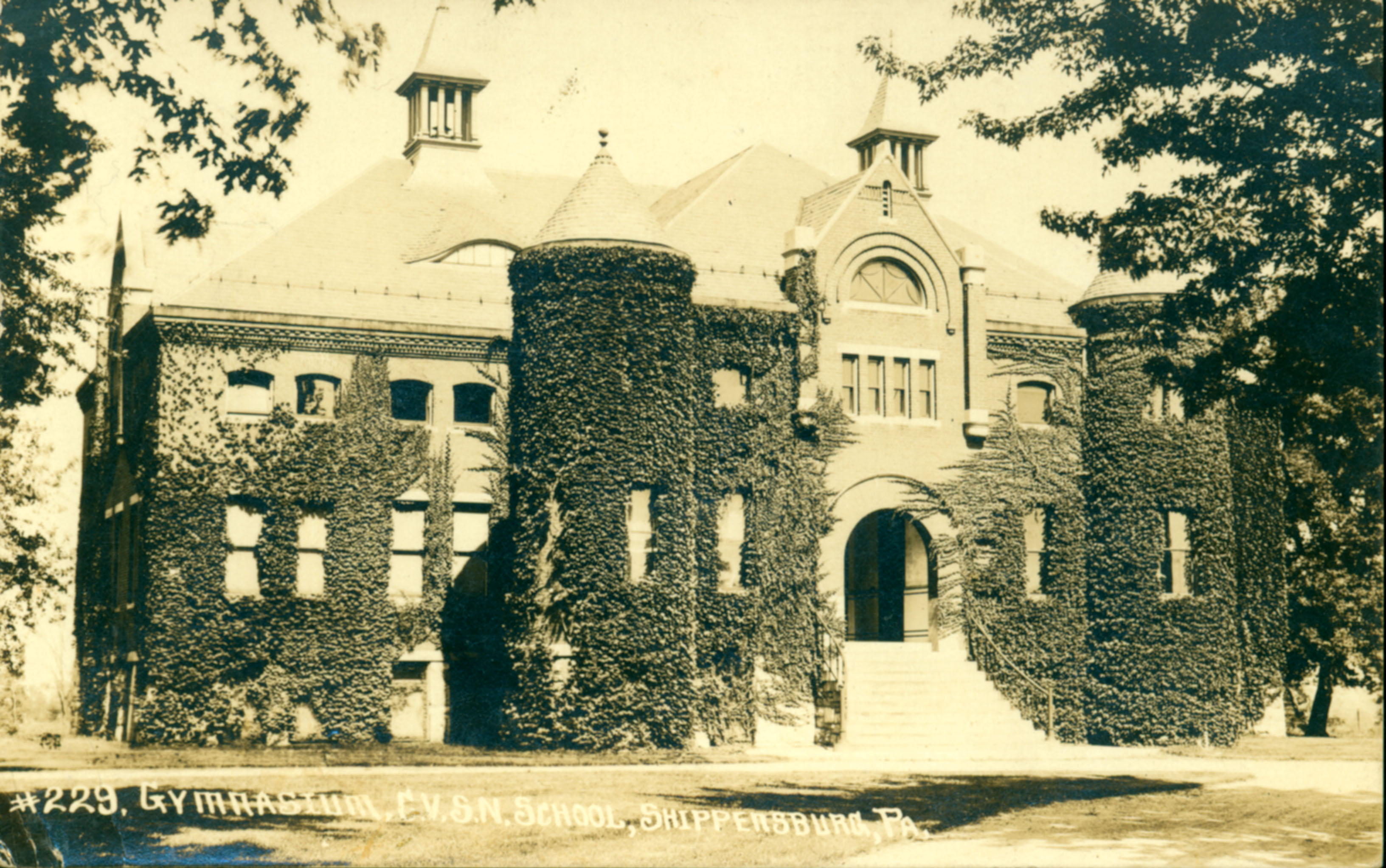 Postcard with caption "#229, Gymnasium, C.V.S.N. School, Shippensburg, Pa." Verso of postcard featuring gymnasium. On verso, later note added at top: "When Mother (Catherine Kinger Kirk) was at Shippensburg College in 1919. Sent to her mother Margart L. (Kirk) Kinger." Verso inscription reads, "This is where we go to take our gymnastic exercises on Monday, Wednesday and Friday, for one hour."