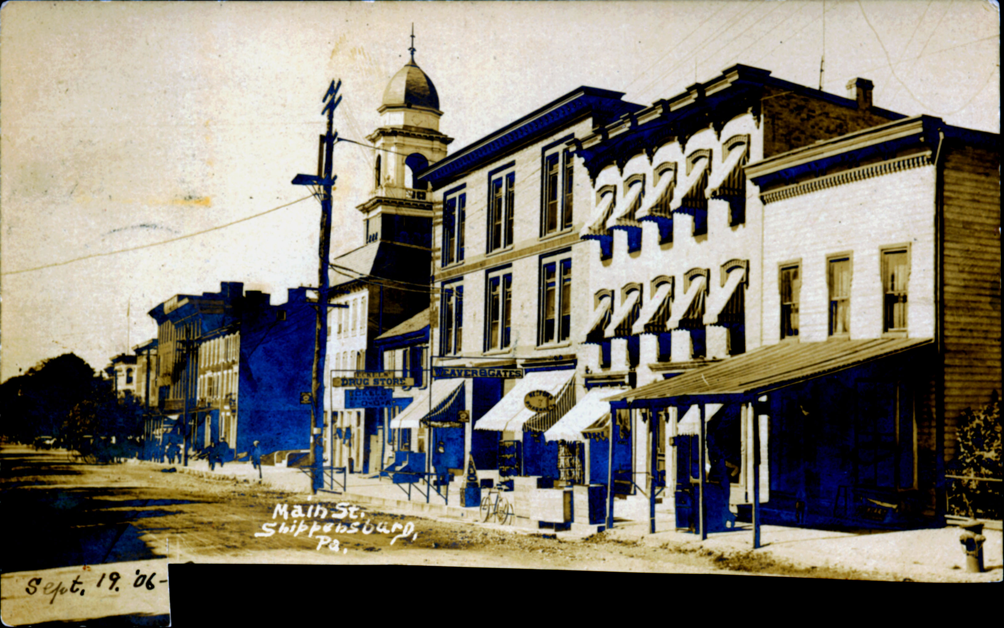Postcard with printed black and white photograph with patches of royal blue coloration added to photo for printing. Main street appears unpaved. A wooden pole with cable is featured prominently. The caption reads "Main St. Shippensburg, Pa." Attached to postcard rector is date "Sept. 19. '06 - " Verso of postcard depicting Main Street, Shippensburg, and addressed to: "Miss Kate E. Grove Pennington [New Jersey]". Bottom left handwritten cursive transcription: "E glantine" Two post office stamps on verso. Both on right. Appears sent from "SHIPPENSBURG, PA SEP19 9AM 1906" and received "PENNINGTON, N.J. SEP 2-- 9AM 1906"
