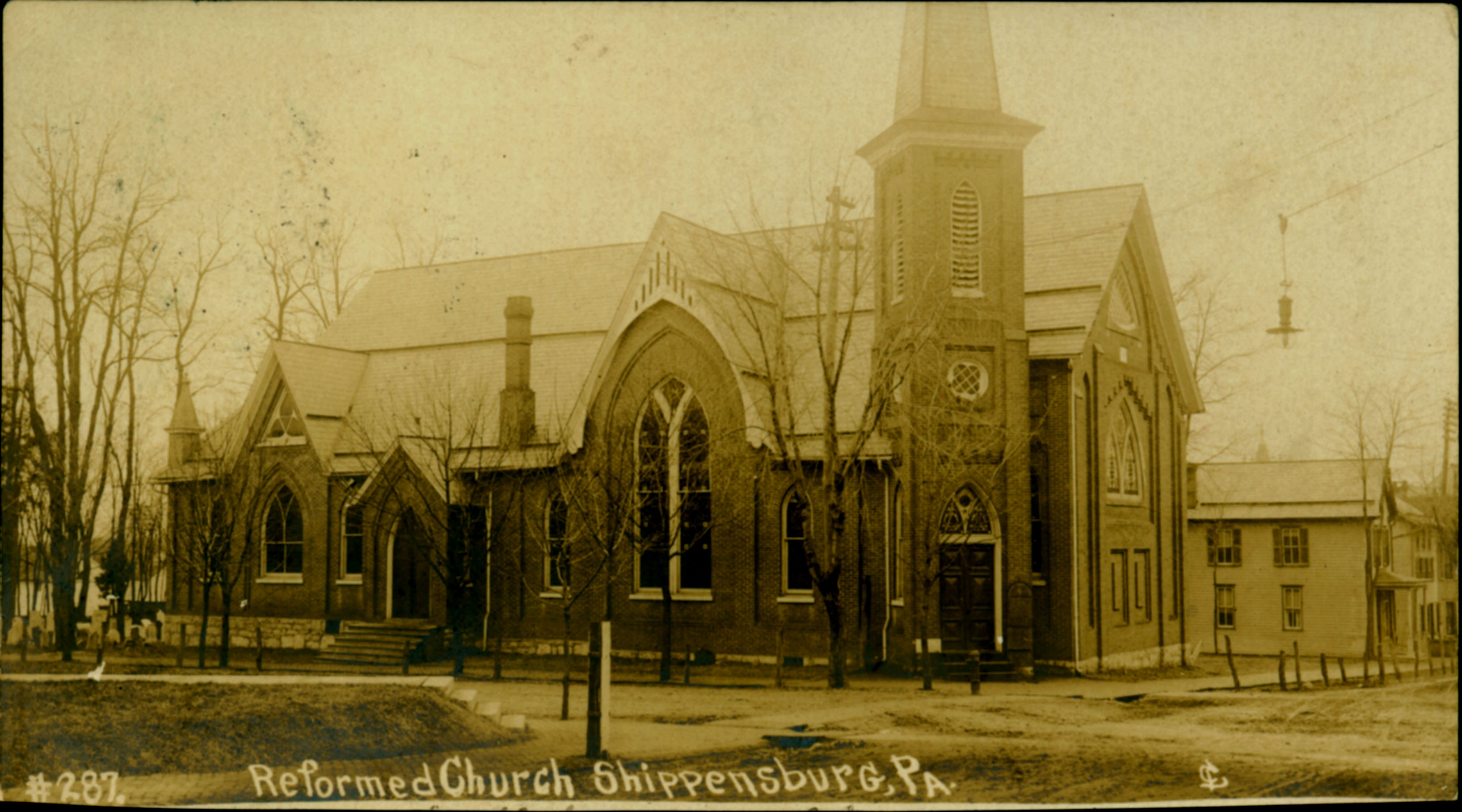 Black and white photographic print postcard of brick church with caption at bottom "#287 Reformed Church Shippensburg, PA." and the photographers logo or emblem to the right of the caption. Verso of Reformed Church postcard addressed to: Miss Kate E. Grove Pennington" Possible part of addressee cut off from bottom. Two post office stamps: Top: "SHIPPENSBURG, [P.A.] JAN29 9 AM 1907"; below: "PENNINGTON, N.J. JAN 30 --AM 1907"