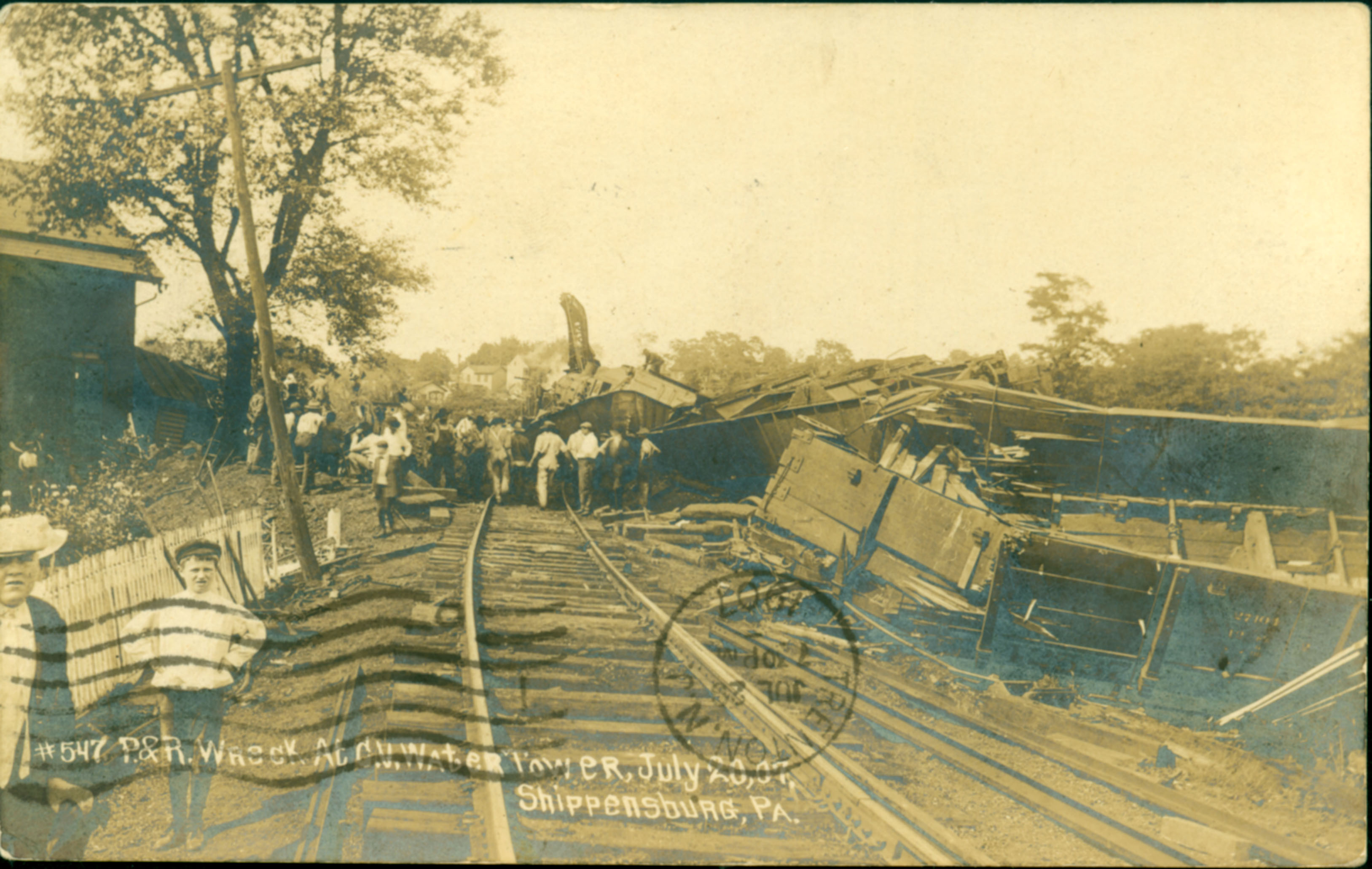 Black and white photograph of train wreck. Man and boy standing in foreground posing. Other people in background focusing on train wreck. Caption reads "#547 P.&R. Wreck At C.V. Water Tower, July 20, 07, Shippensburg, PA." Verso addressed to: "Miss Katherine E. Grove Pennington New Jersey" Verso message transcription: "Many thanks for card. On the other side you can see part of Mrs. Woods wrecked kitchen and three carloads of coal were dumped at their back door. To the right was their potato patch in which was dumped 13 broken cars. You can see part of one engine. It is crossways of the track. C.L.G." Rector: Post office stamp in ink "TRENTON, N.J. JUL28 730PM 1907" Verso: Two partially legible post office ink stamps- right" "SHIPPENSBURG, PA. JUL29 9AM 1907" and left: "PENNINGTON -- JUL30 7-- 1907"