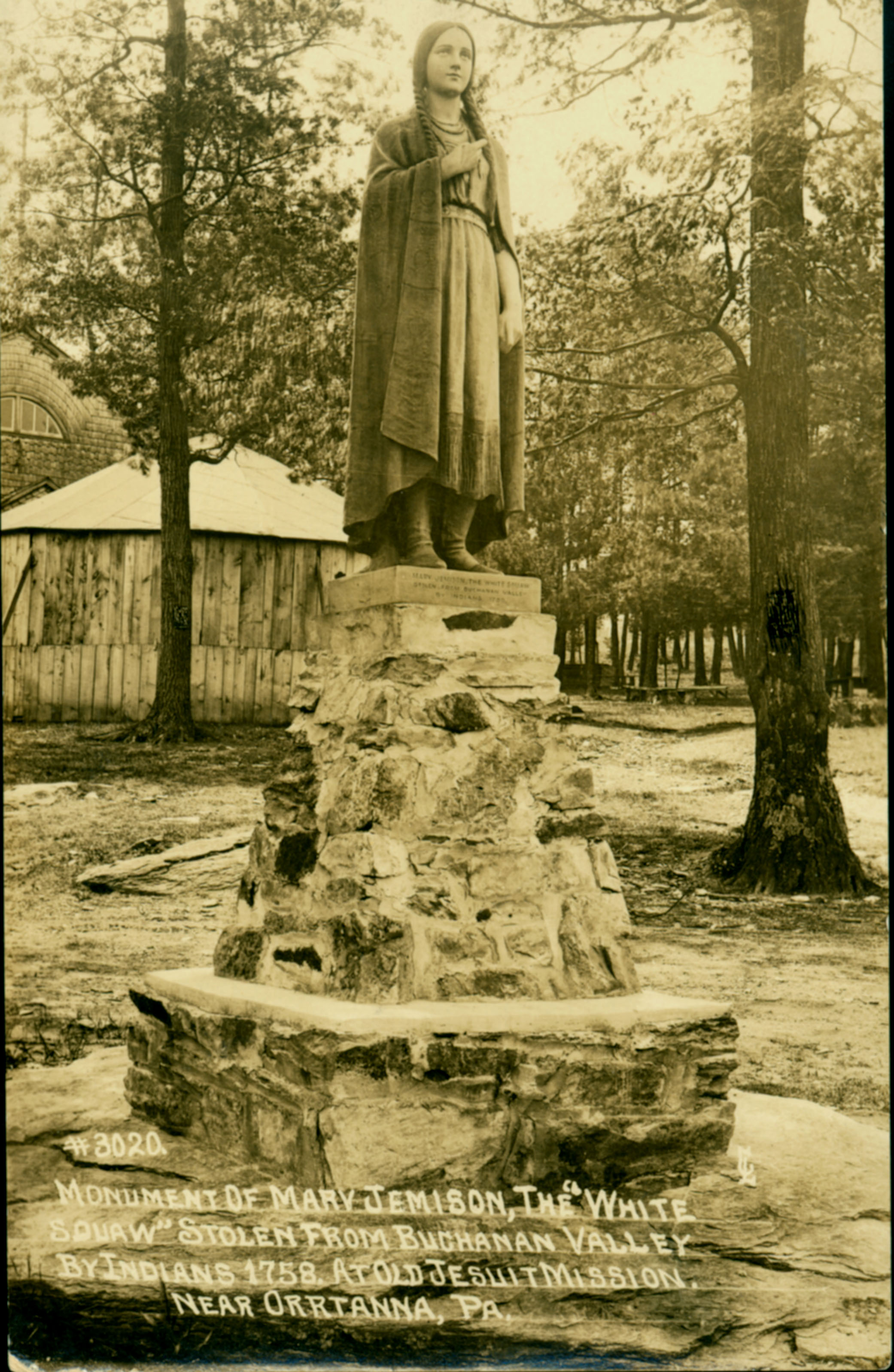 Black and white photographic postcard of monument of Mary Jemison. Monument in a wooded setting. Postcard caption reads, "#3020. Monument of Mary Jemison, The "White Squaw" stolen from Buchanan Valley by Indians 1758. At Old Jesuit Mission. Near Orrtanna, Pa."