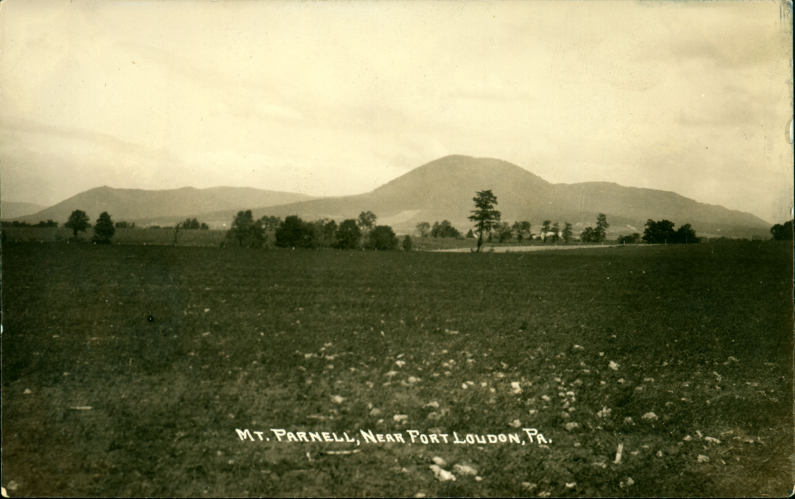 Black and white photographic postcard with a scenic view of a field and mountains in the backdrop with caption "Mt. Parnell, near Fort Loudon, PA"